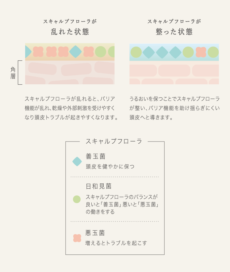 頭皮には、スキャルプフローラと呼ばれる様々な常在菌が存在します。常在菌には、善玉菌・日和見菌・悪玉菌が存在し、うるおいを与えることでこれらのバランスが整い、バリア機能を助け揺らぎにくい頭皮へと導きます。