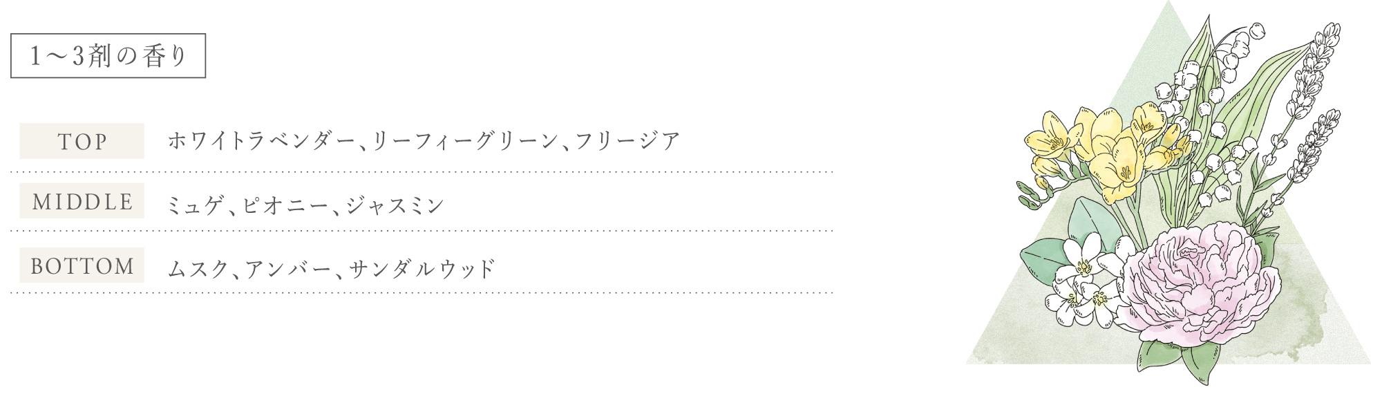 ミュゲ、ピオニー、ジャスミンを基調に、爽やかなホワイトラベンダーやリーフィーグリーンを折り重ねた、心の奥まで澄みわたる香り。透明感のあるすっきりした香りは、庭園の草花を彷彿とさせ、そっと心をほぐします。