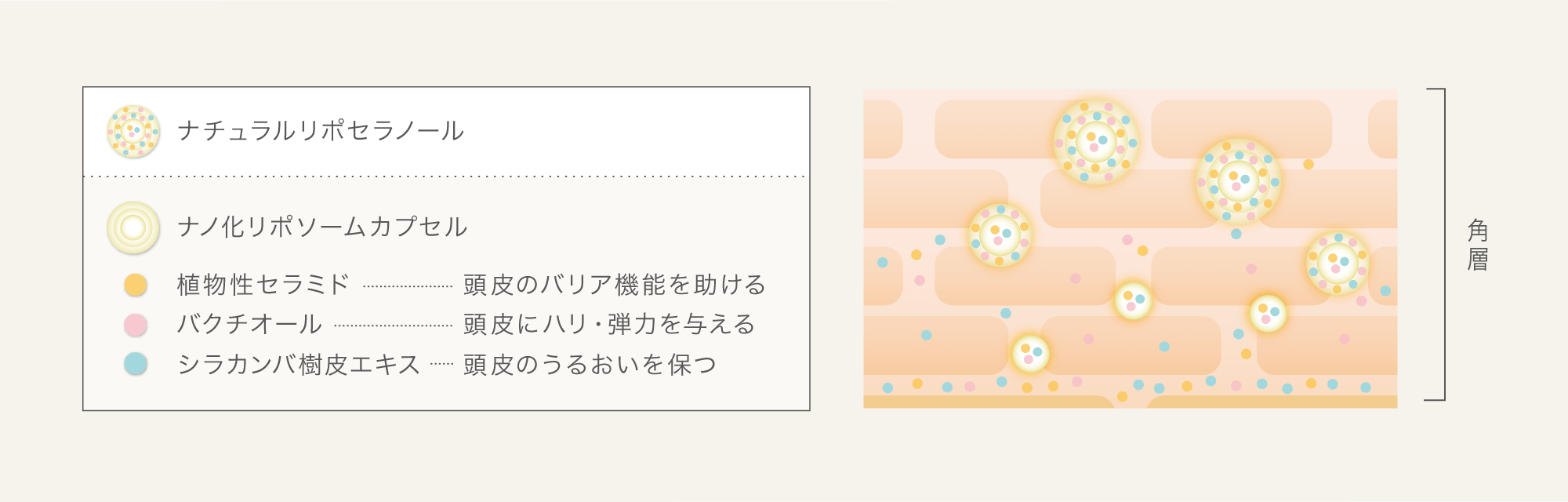 コタオリジナル成分「リポセラノール」を植物由来成分に置き換え、進化した「ナチュラルリポセラノール」。うるおいを与えることで、頭皮のバリア機能を助ける「植物性セラミド(ユズ果実エキス)」と、頭皮にハリ・弾力を与える「バクチオール」、新たに保湿成分として「シラカンバ樹皮エキス」を内包した、ナノ化リポソームカプセルが頭皮の角層の奥まで成分を届け、しっかりと浸透し作用します。